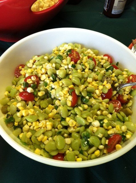 photo (222)Sandwiched between a soft roll, I watched everyone layer tender slices of brisket or pulled pork and then top their meat with bbq sauce and other condiments. The cool contrasting textures of corn, lima beans, grape tomatoes, pickled okra, and green onions in the creole succotash salad complimented the warm tangy bbq sandwiches.