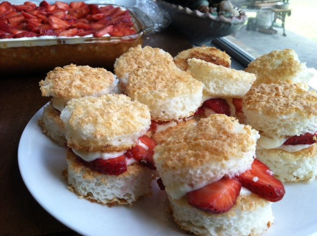 To create, I simply baked the angel food cake in a 13×9-inch glass baking dish. I would suggest putting a piece of parchment paper at the bottom before adding the batter to make it easier to remove from the dish. Angel food cake likes to stick. I did lightly grease the sides of the dish as well. After it has cooled, remove from the baking dish and using a biscuit cutter, cut into tall rounds. I then sliced the cake rounds in half. Instead of mixing the cream filling with the strawberries, I spread a layer of filling and then topped it with the strawberry slices.