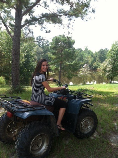 After lunch (dinner), my dad and I went out to our land to try out the 4-wheeler he just bought. I hopped on for a minute before changing into a pair of shorts, t-shirt, and tennis shoes. At the “wheel,” I drove my dad and I around. We were just making our way through the first path when I heard him say you were supposed to duck.