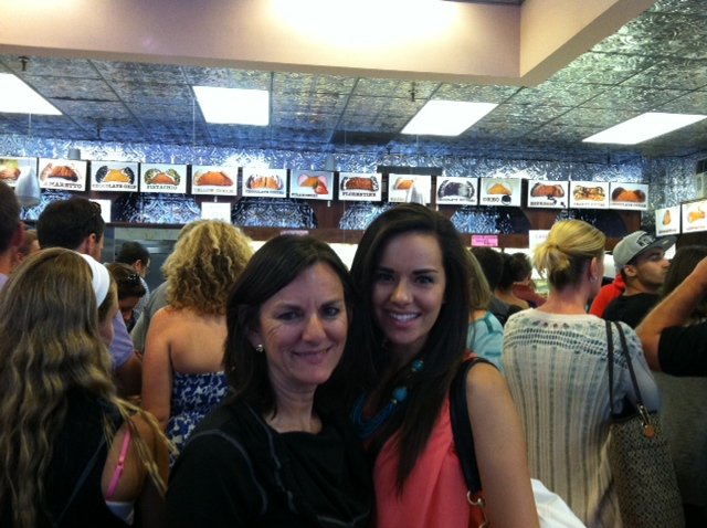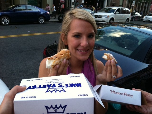 The first difference I detected in the cannoli shells were the crunch factor. At Modern Pastry, the cannoli shells are filled to order. I think this definitely gives their shells a great crunch. At Mike”s Pastry, they have a glass counter full of already filled cannolis. Their shell was not as crunchy. For the fillings, both have a ricotta cheese filling but Mike”s filling to me is a little more sweet. I kind of like the less sweeter filling of Modern Pastry. My mom and sister got in on the judging. Britt (holding the cannolis) did not care about the shell she went straight into the filling. She loved Mike”s Pastry filling. My mom liked Mike”s Pastry too. I couldn”t believe we were not all on the same page. At the end of the day, we had a sweet finish to our perfect day in Boston.
