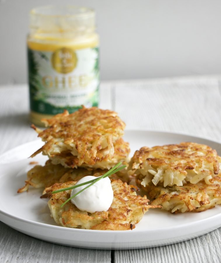 I’ve made these latkes one of other time since our trip to NYC. I found a recipe for them by Food & Wine. This time I made a few changes to the recipe. One of the changes I made was to use ghee to fry the latkes in instead of oil. I thought the flavor the ghee added was better than oil. Ghee is butter but the milk solids, casein has been removed. I began cooking with ghee after my youngest son was born. He has a dairy intolerance so while breastfeeding, I couldn’t have dairy. I could have ghee though because it doesn’t have milk casein. I used ghee just like butter. It is great for sautéing vegetables, panfrying and cooking pancakes because it doesn’t burn like butter. It has a high smoke point.