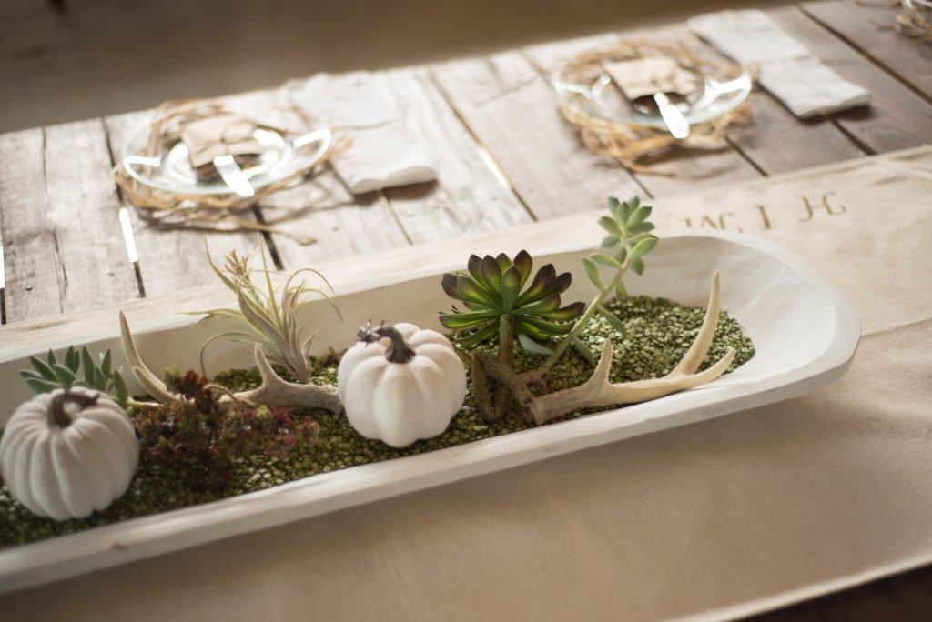 For my Thanksgiving table decor that my mom and my sister Brittyn helped me style for the photo shoot, we used a large dough bowl for the centerpiece. We filled the dough bowl with dried split green peas. You can find these in the dried beans and pea section in your grocery store. Then we used succulents, small white pumpkins and deer antlers to fill the space.