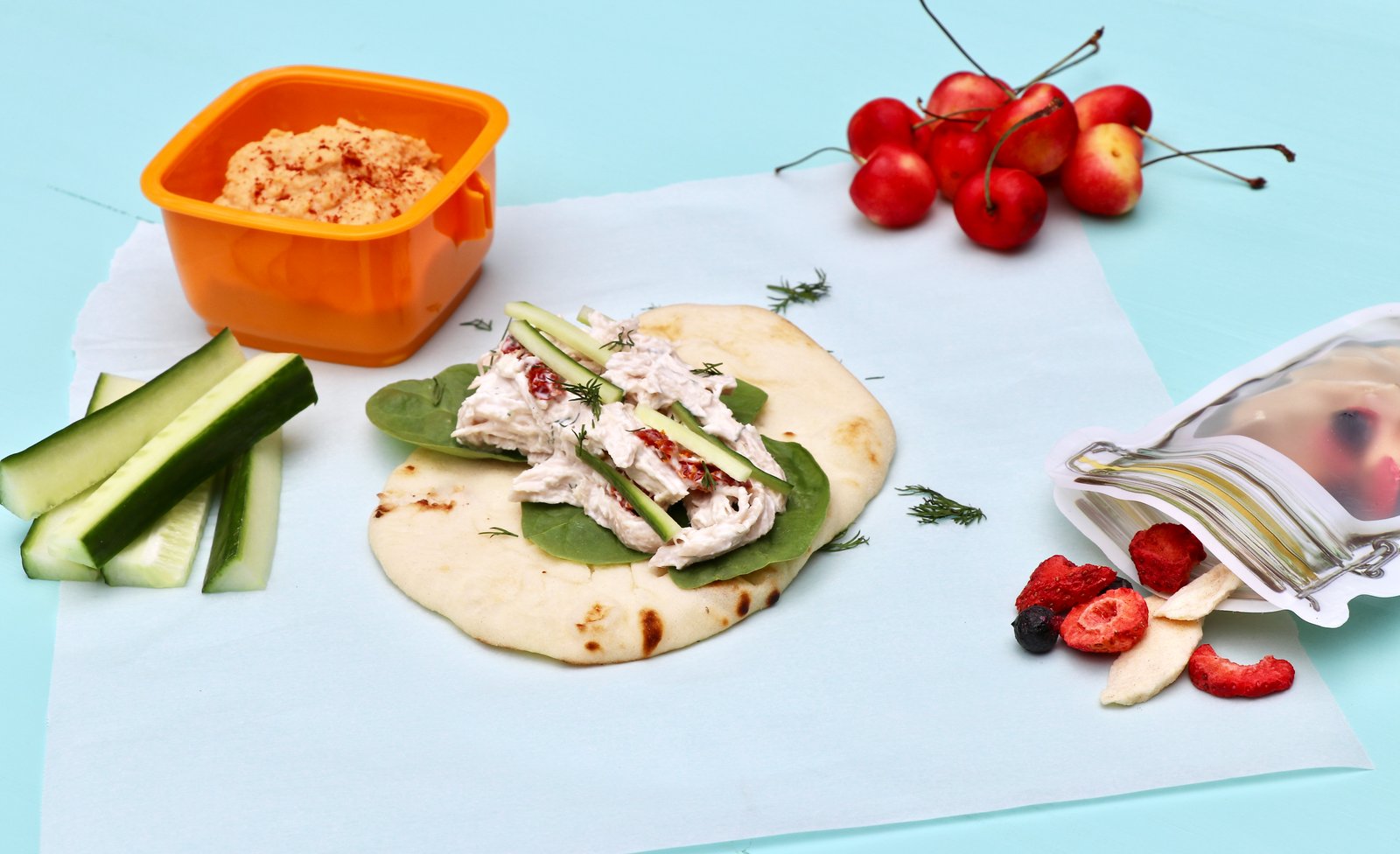 For the main meal, I prepared a tzatziki chicken salad. I remember the days of turkey and cheese and peanut butter and jelly sandwiches. They were good but I grew bored of them. This flavor packed tzatziki chicken salad is a healthier version of chicken salad made with a tzatziki sauce of Greek yogurt, a little mayonnaise, garlic, lemon juice and fresh dill. The kids can make it into a sandwich with mini naan bread. Adults can enjoy it over mixed greens or follow the kid’s direction and wrap yours in a naan as well.