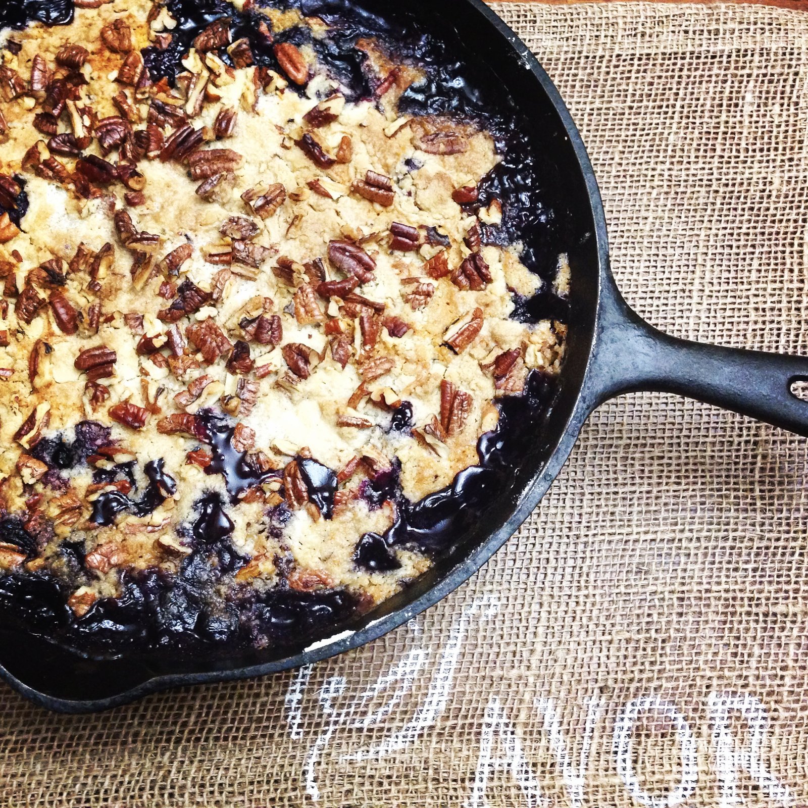 - Pour the crushed pineapple in the bottom of a large castiron skillet or 13×9-inch glass baking dish. Then evenly distribute the blueberries over the top.