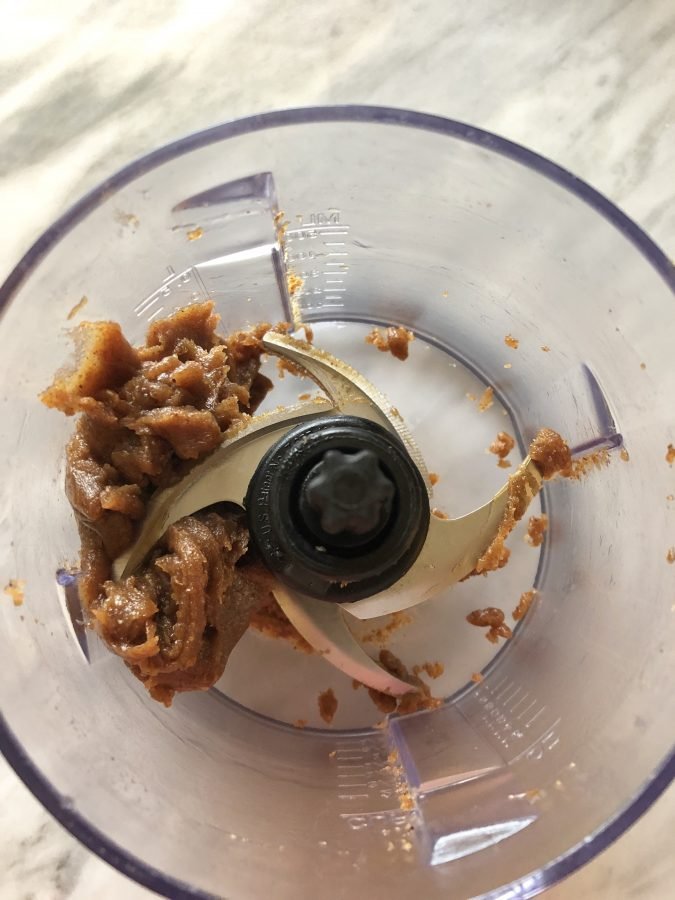 Process until a paste forms. You may have to stop the food processor a few time to scrape down the sides of the container.