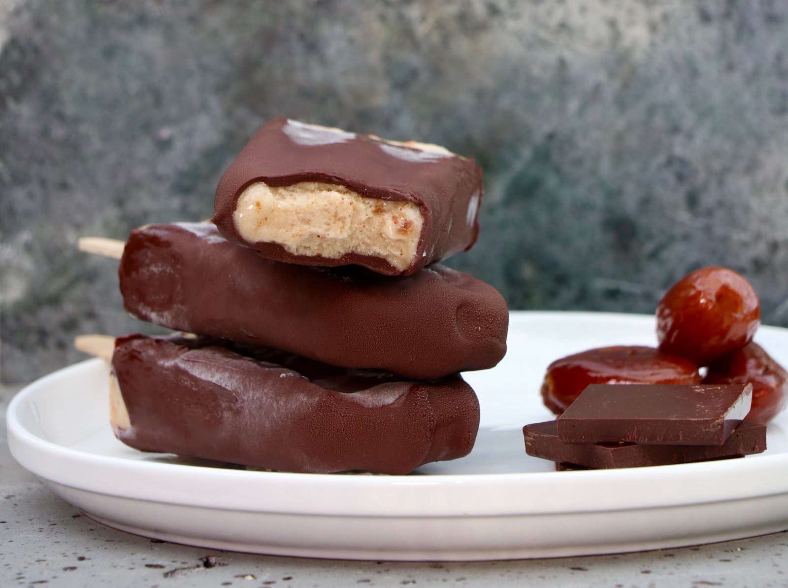 Remove the bananas from the freezer and break into pieces. Place the banana pieces in the food processor with the date caramel. Process until a thick ice cream mixture forms, about 2 to 3 minutes. You may have to stop the food processor to scrape down the sides of the container a few times. Immediately spoon the mixture to popsicle molds. Push popsicle sticks halfway through the middle of each mold. Place in the freezer and freeze overnight.