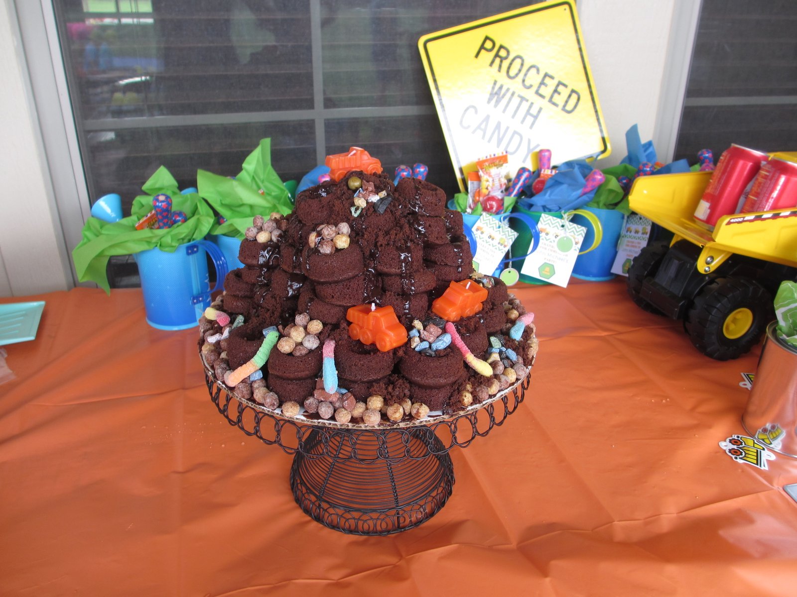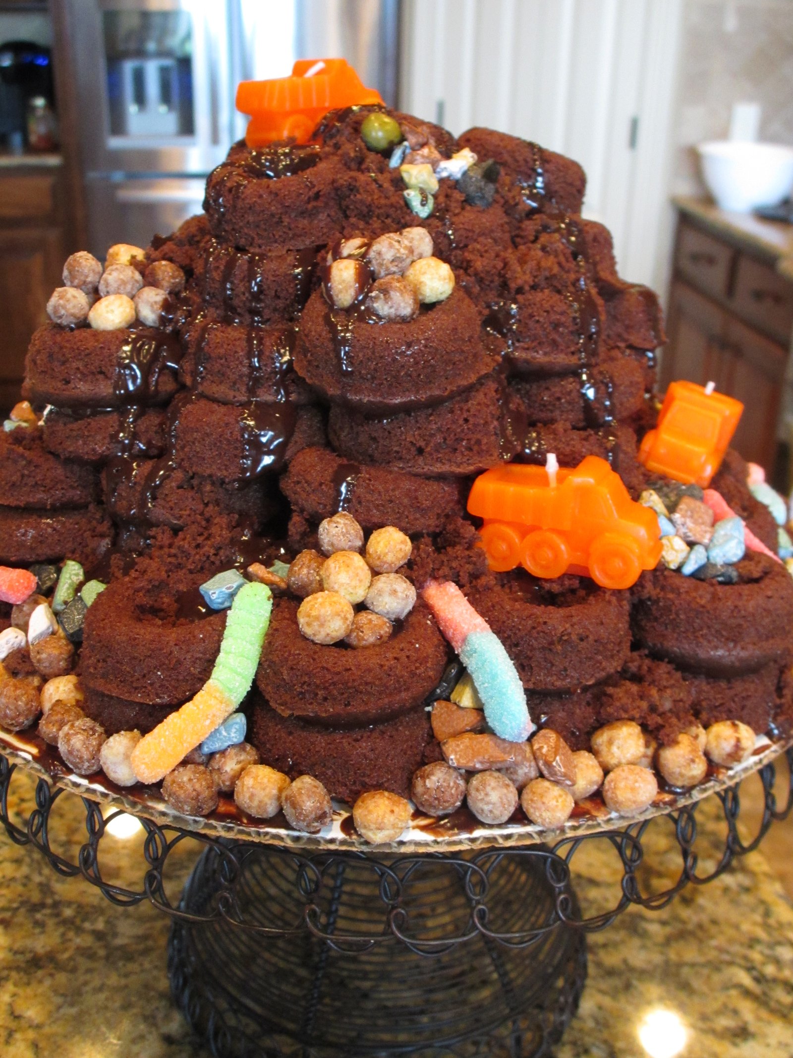 For my nephew’s 2nd birthday party, my sister planned him a construction theme party. I wanted to create him a one-of-a-kind cake with his chocolate mini donut stacked dirt pile cake.