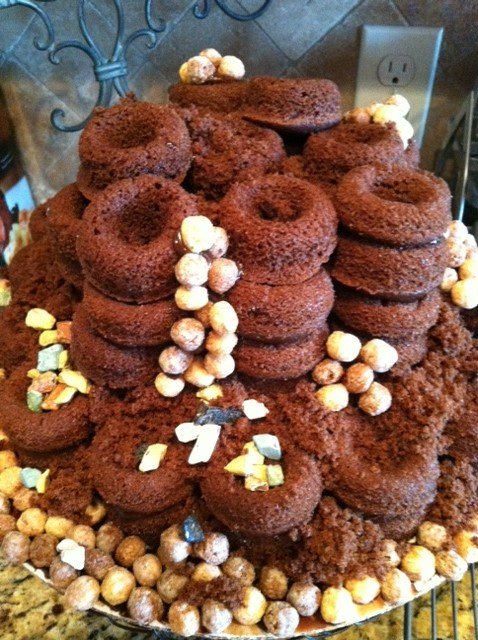 Place a layer of mini donut cakes on a cardboard cake round. Dip the bottom of each cake in some of the ganache and stack on top of the first layer of donut cakes.