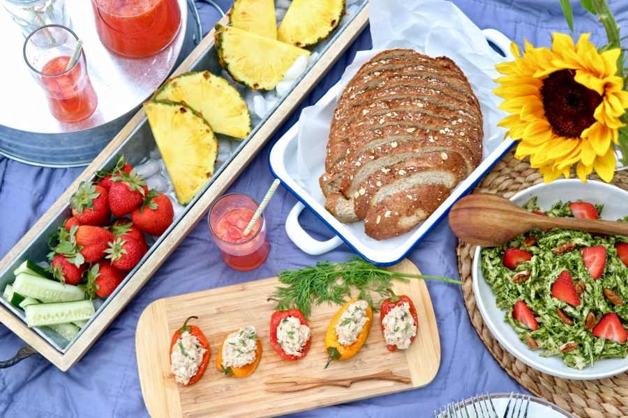 Of course I made a tuna salad but with my own twist by adding diced cucumbers and dill. I then stuffed roasted sweet peppers with the creamy dill tuna salad. Chicken salad which is also a favorite of mine was dressed differently this time. Instead of mayonnaise, I tossed shredded chicken with spinach and basil pesto. I topped the pesto chicken salad with strawberry slices and toasted pecans. It is delicious served over greens or on bread.