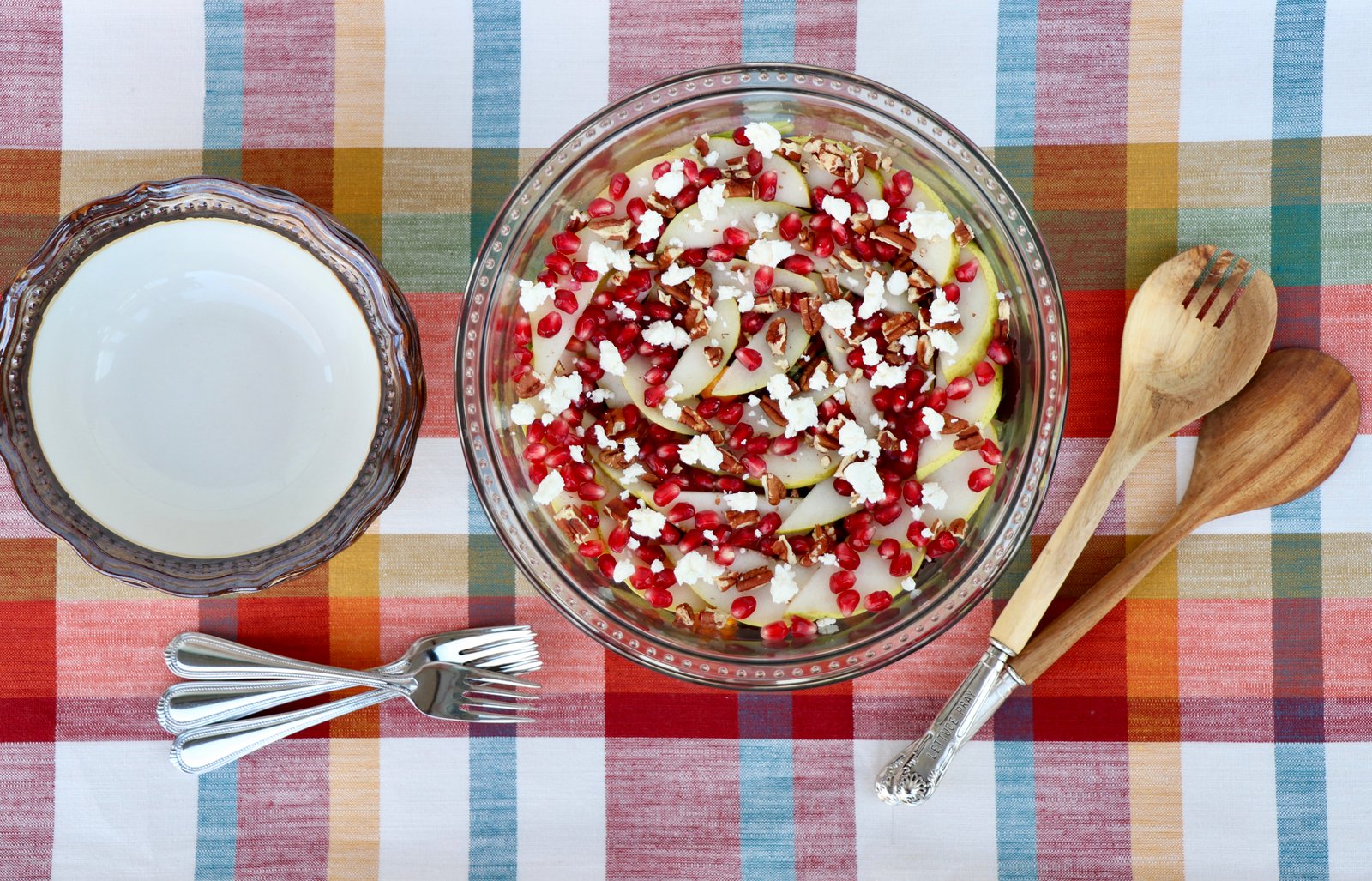 In the South, the layered salad has been a popular potluck and special occasion staple usually featuring iceberg lettuce, peas, tomatoes, eggs, cheese, and bacon. I put a festive holiday spin on this classic by using seasonal ingredients and red and green hues.