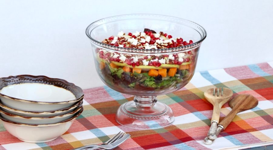 Mixed greens, roasted butternut squash cubes, thin pear slices, pomegranate arils, toasted pecans and creamy goat cheese are layered in a trifle bowl to create this festive holiday layered salad. You can also substitute ingredients of your liking and add pasta or grains and meat for a heartier version.