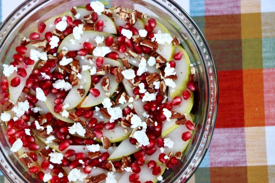 To assemble the salad, layer in order the mixed greens, roasted butternut squash, pear slices, pomegranate arils, toasted pecans and goat cheese in a trifle bowl.