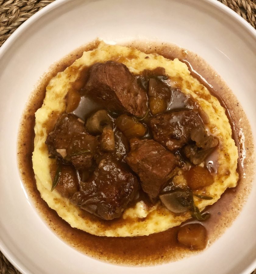 Cover and bake in the oven for 1 ½ hours. Remove from the oven. Add the mushrooms. In a small bowl, mash the butter and flour together. Stir into the stew. Transfer back to the oven and cook for another 10 to 15 minutes or until the mushrooms are tender. Serve over creamy grits, polenta or mashed potatoes.