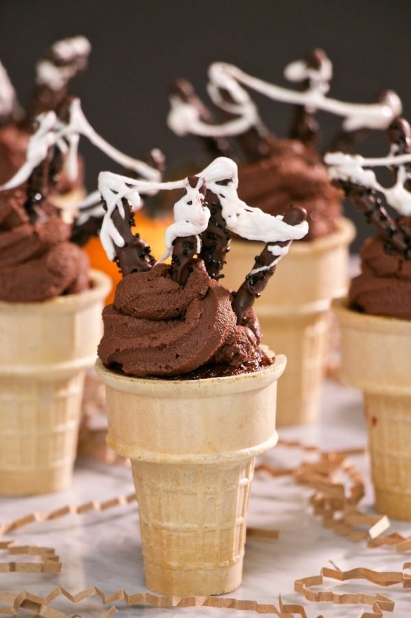 We topped the cupcake cones with a whipped ganache topping. I think it is so much tastier than traditional frosting. The ganache is a perfect way of using your leftover Halloween chocolates. Chop the chocolates and measure them out like you would chocolate chips in the recipe. Melt the chocolate by pouring hot heavy cream over the top. Stir until melted and then allow to cool and thicken. Once cooled completely, whip using an electric hand mixer until fluffy. You can use a piping bag with an open star tip or pipe using a zip loc bag with the corner snipped 1/2-inch.