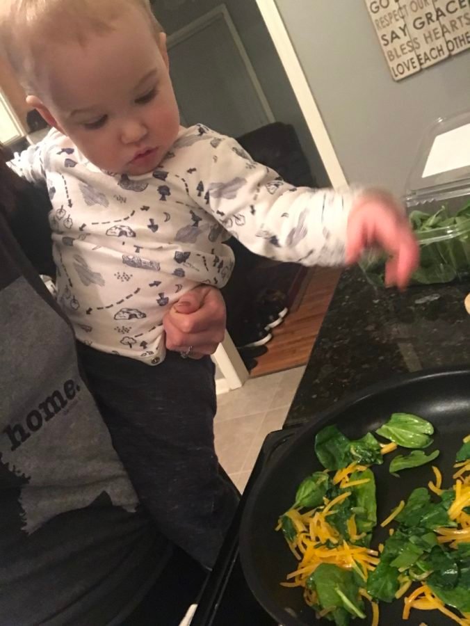 Step 3) Insert little helper. My son added spinach to the skillet with the butternut squash noodles.