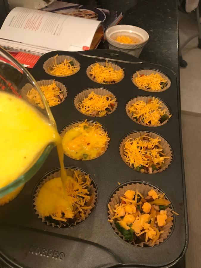 In a bowl whisk the eggs, milk or cream, salt, and pepper until combined. Divide the egg mixture evenly among the muffin cups.