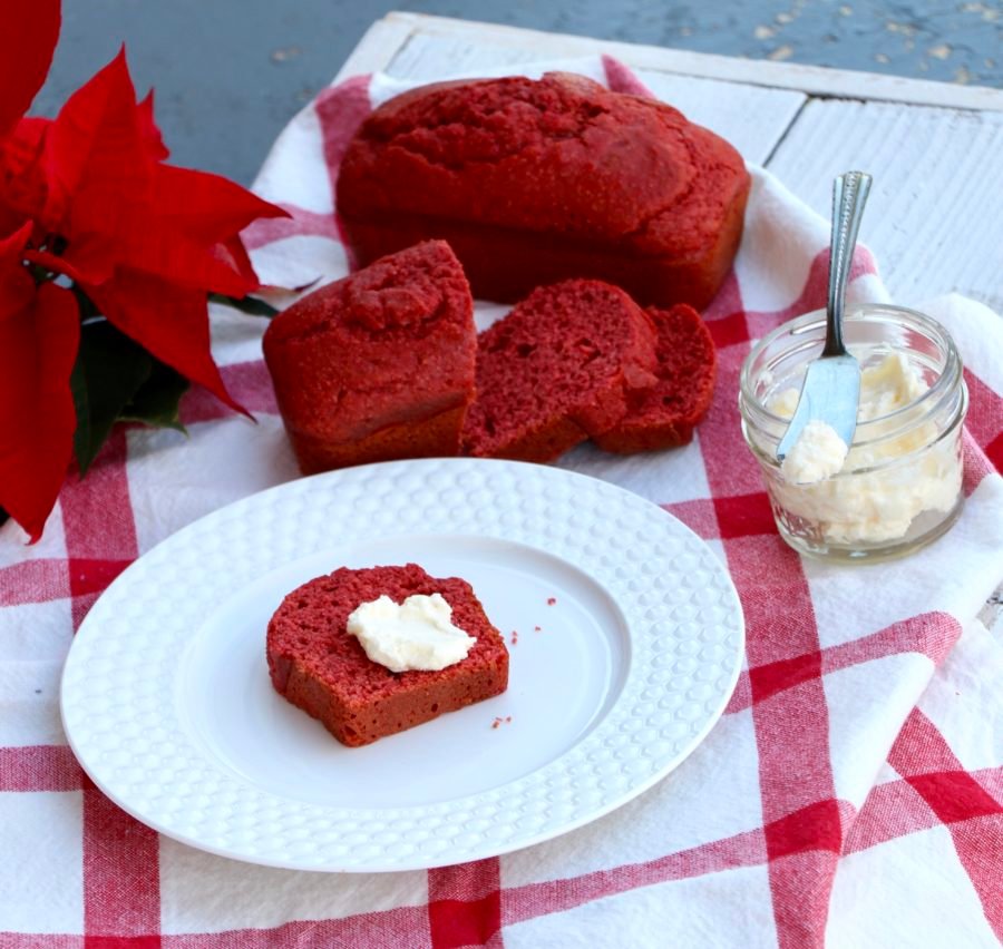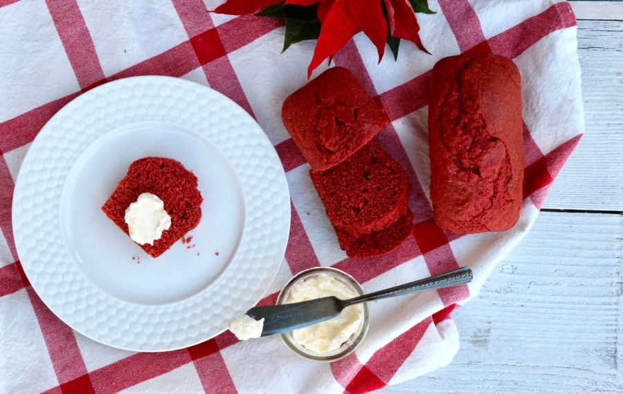 I then added the components of a red velvet cake like cocoa, buttermilk and red food coloring. If you want to make a natural red hue to the cornbread, you can add 1/2 to 3/4 cup beet puree. A red velvet cake would not be complete without cream cheese frosting. So for my red velvet cornbread, I whipped up a cream cheese spread.