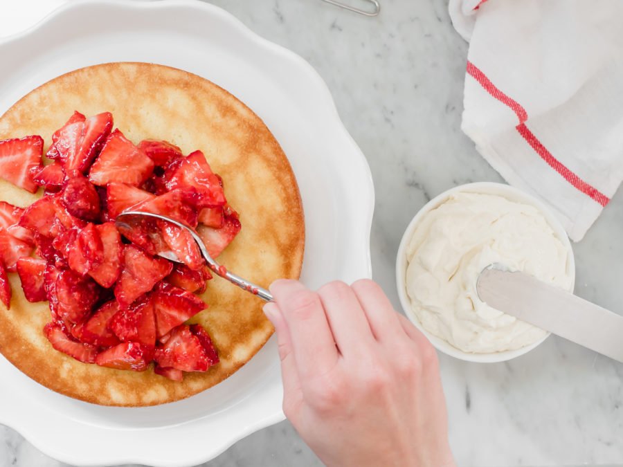 To assemble the cake, place one of the cakes on a cake plate. Top with the macerated strawberries. Spoon the cream filling on top and gently spread over the berries. Top with the other cake. Spoon the whipped cream over the top of the cake. Lastly, garnish with the remaining whole strawberries.
