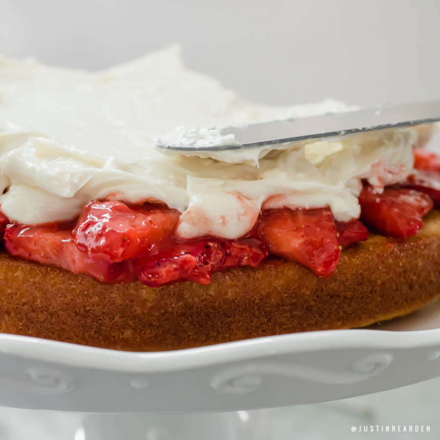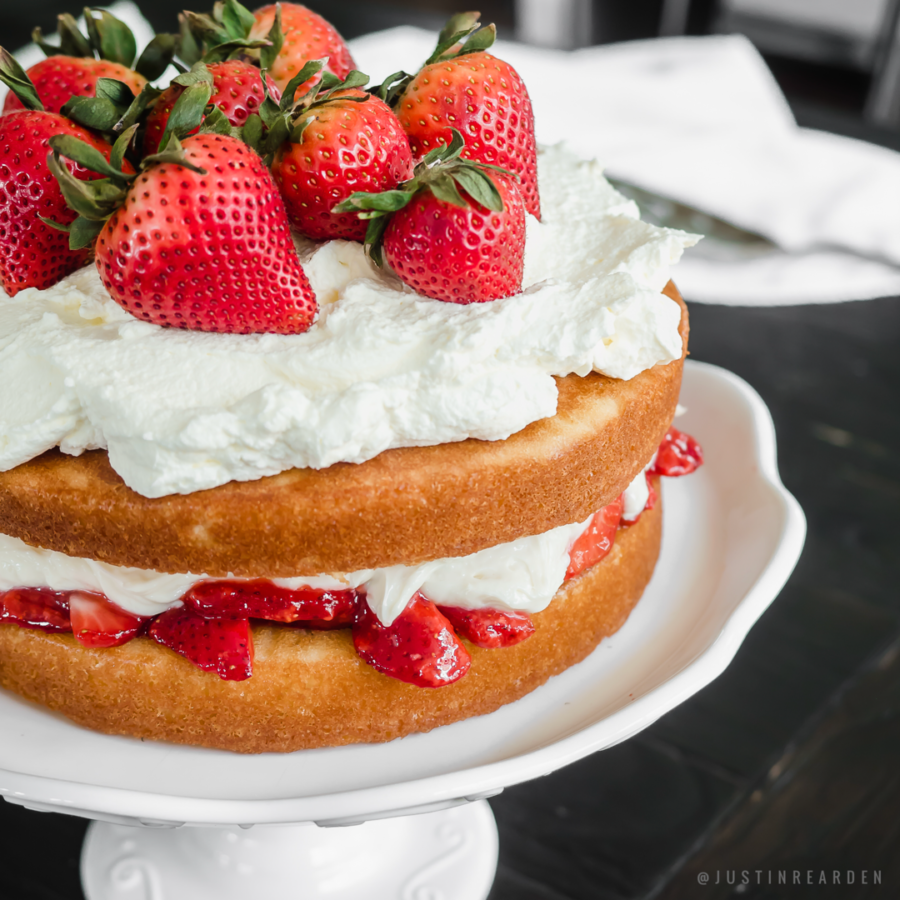 Lastly, the cake is topped with a sweetened homemade whipped cream and strawberries for garnish.